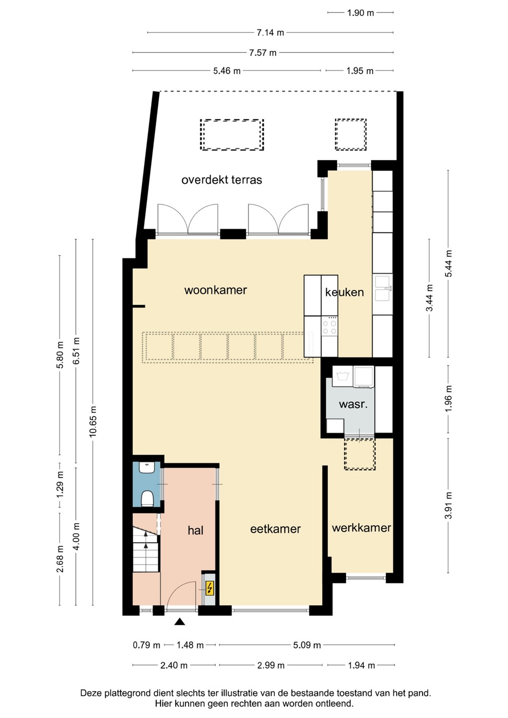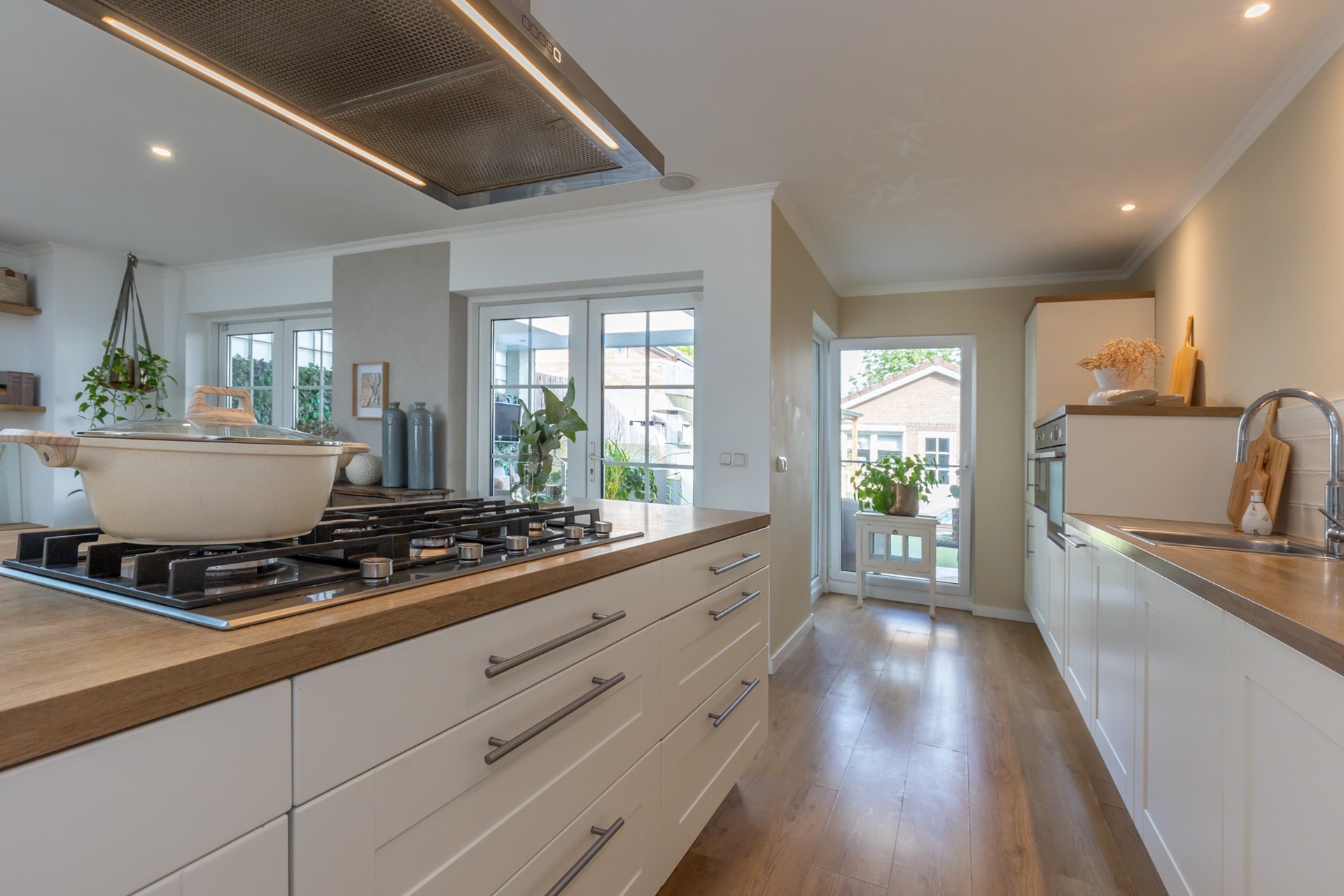entree, hal, meterkast met ruim voldoende groepen, lichte en ruime woonkamer (70 m2) met aanbouw met lichtstraat en openslaande tuindeuren naar de grote overkapping, werkkamer/kantoor (7,6 m2) met airco, bijkeuken met aansluitingen wasmachine en droger, open keuken (10,6 m2) met schiereiland en veel kastruimte, koelkast, vriezer, oven, combi-oven, afzuigkap, vaatwasser en 5-pits gaskookplaat. Woonkamer en keuken zijn voorzien van vloerverwarming.