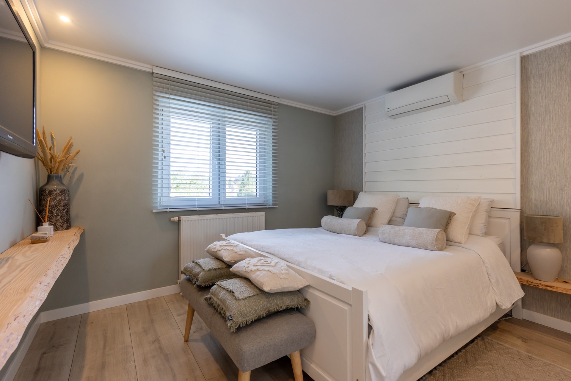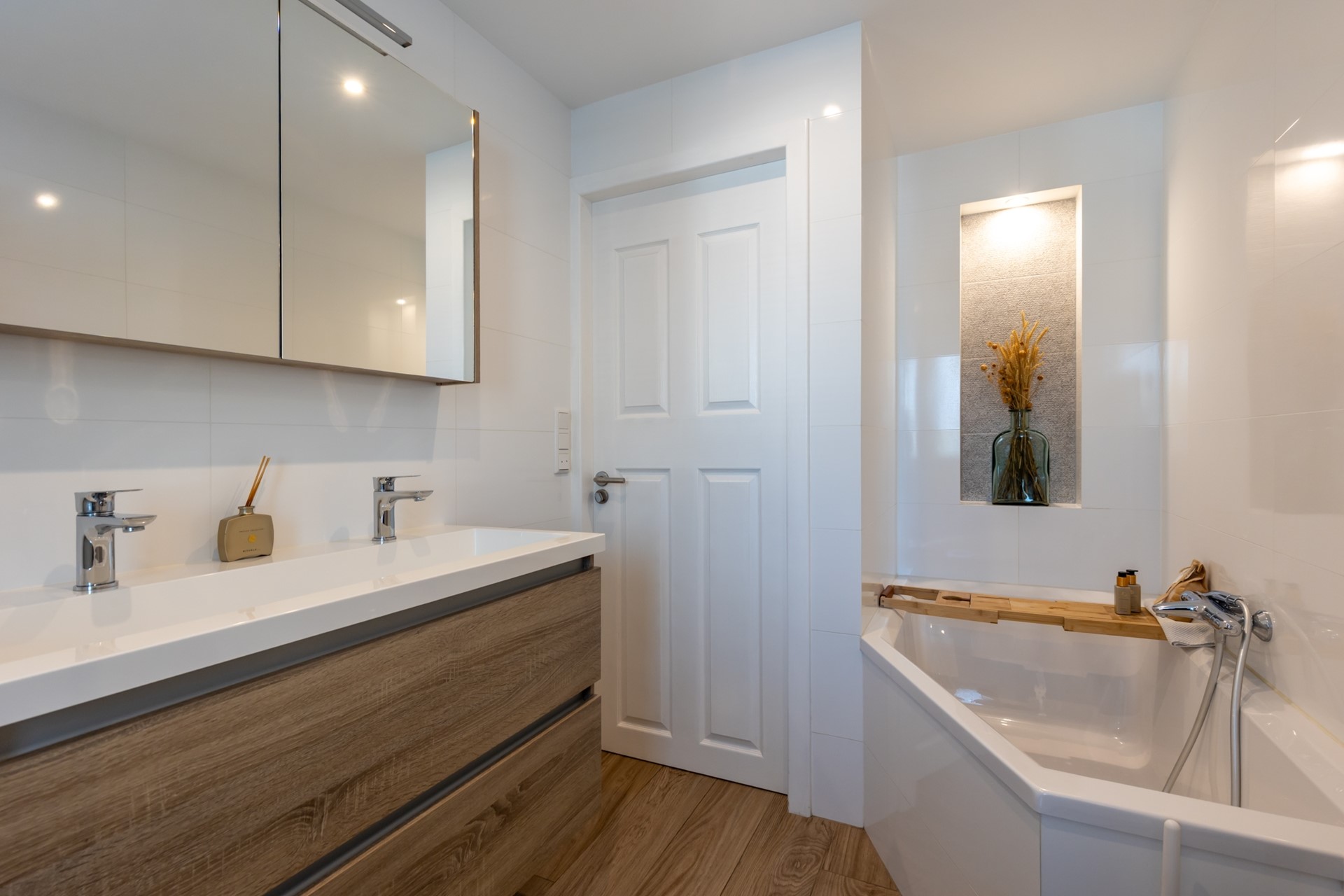 overloop, 2 slaapkamers (10.5 en 12.5m2), 1 met airco en moderne badkamer (6m2) met vloerverwarming, inloopdouche, ligbad, toilet en dubbele wastafel in
