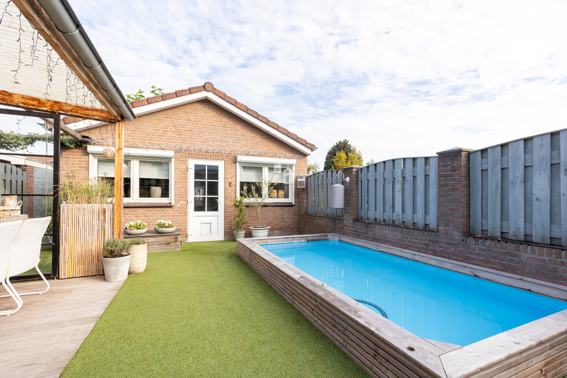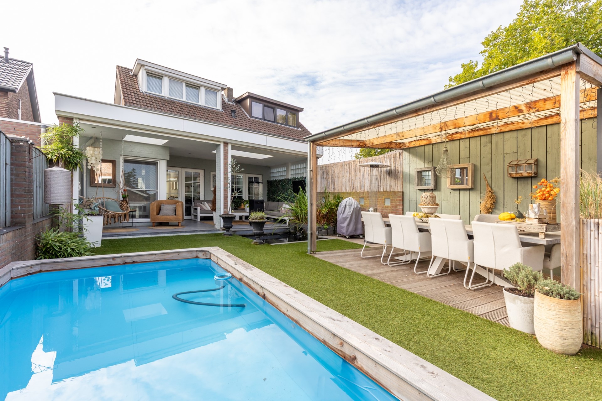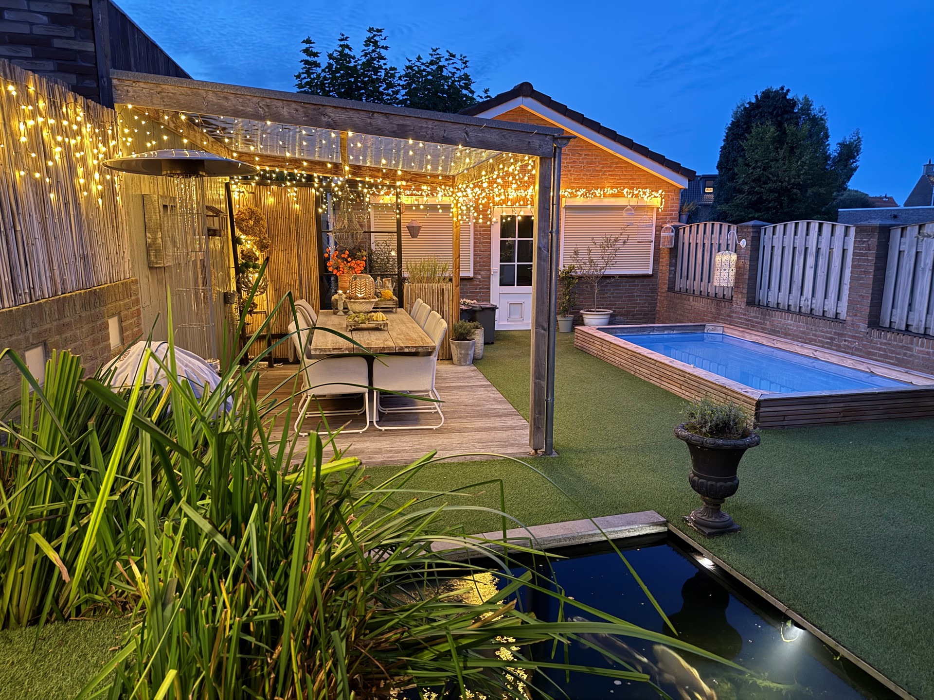 voortuin, gezellige achtertuin met diverse zitgelegenheden waardoor je altijd van de zon of schaduw kunt genieten en met grote aangebouwde overkapping (23m2), vrijstaande overkapping (12m2), koivijver, zwembad, grote garage (36m2) met kap/zolder, elektrische sectionaalpoort en toilet, ruime oprit voor 3 auto’s. Toegang tot perceel via oprit aan achterzijde.