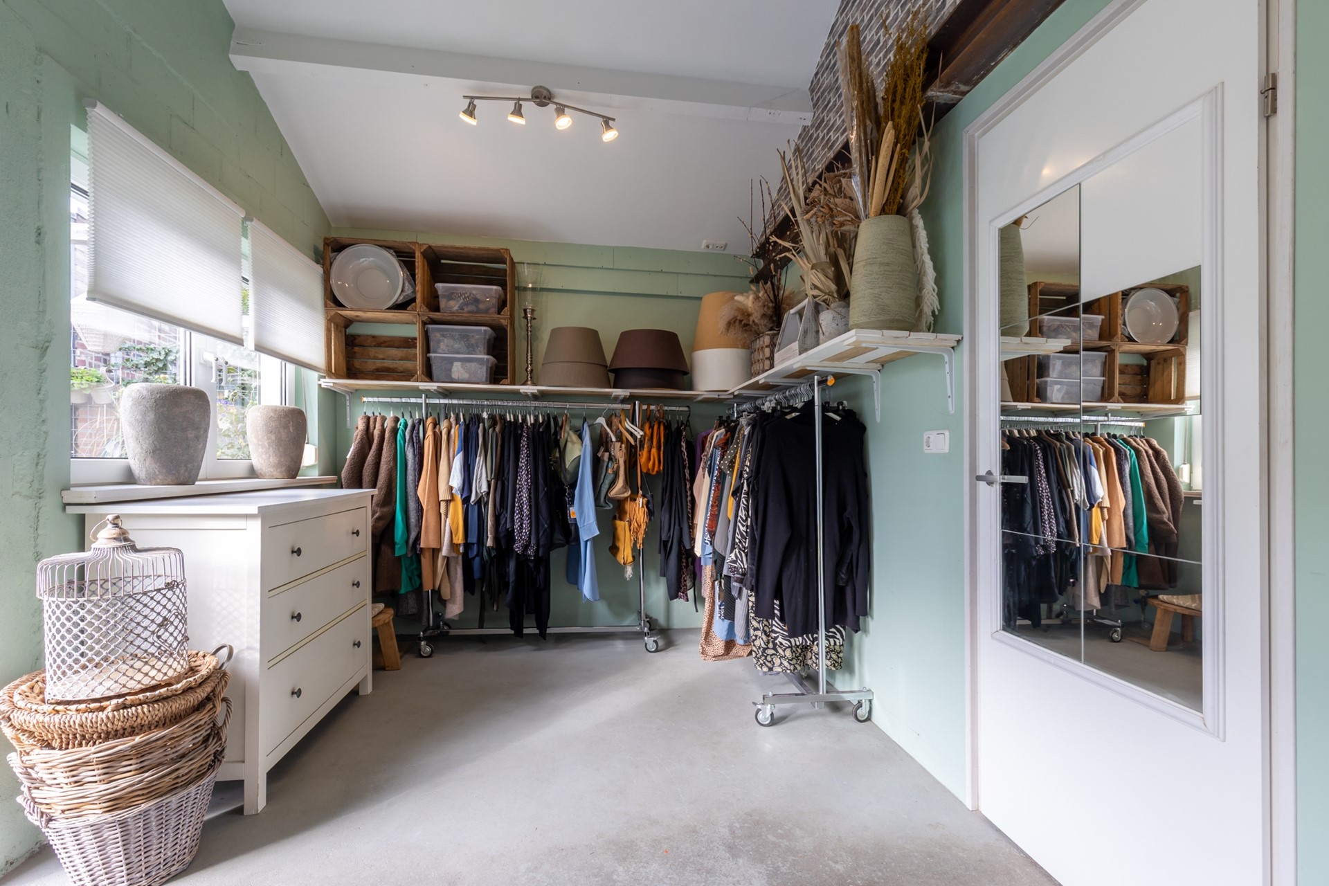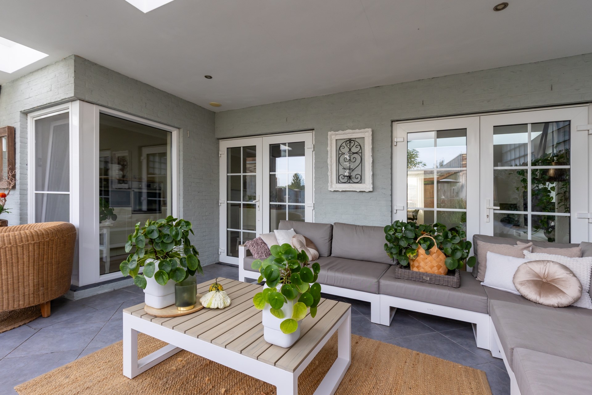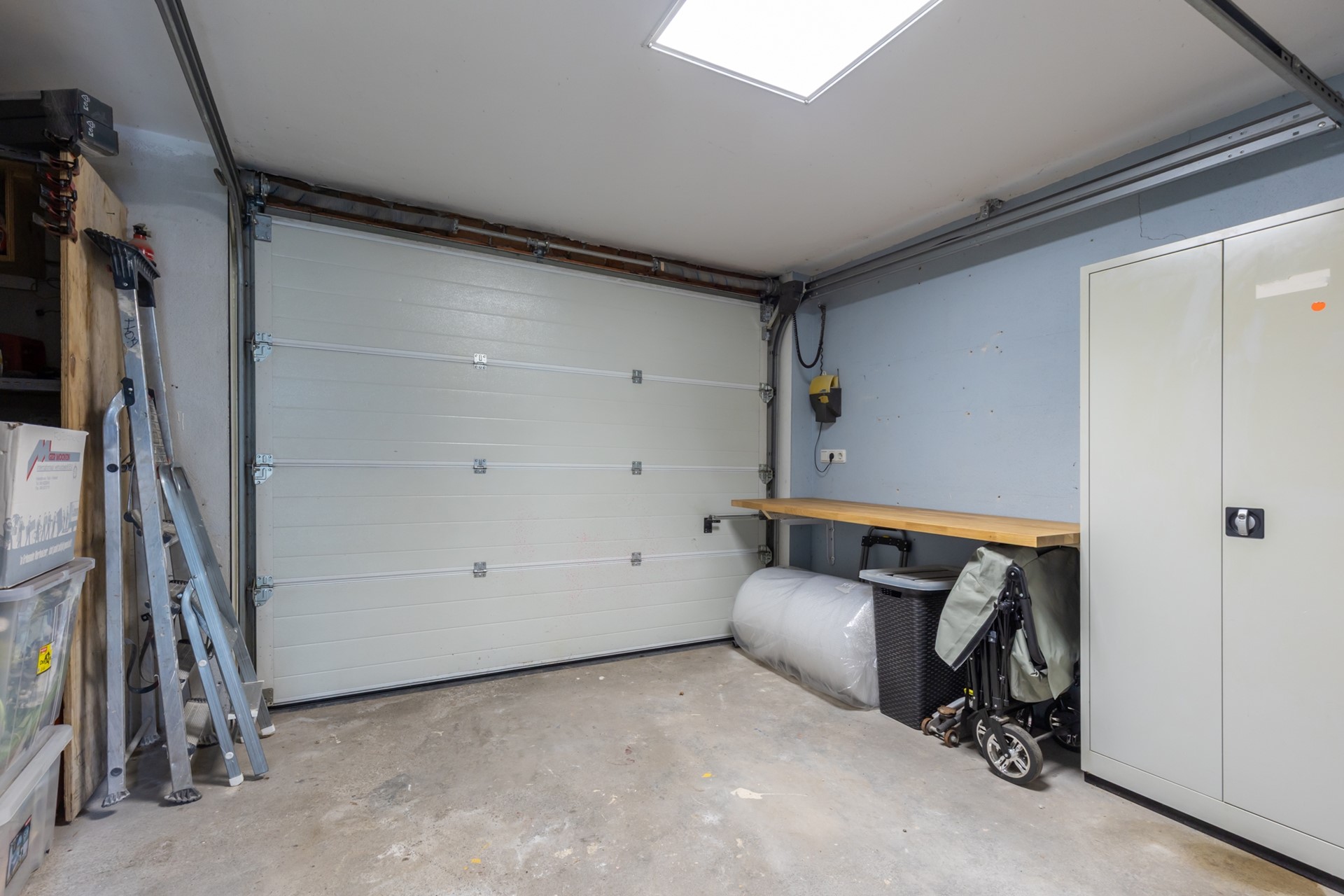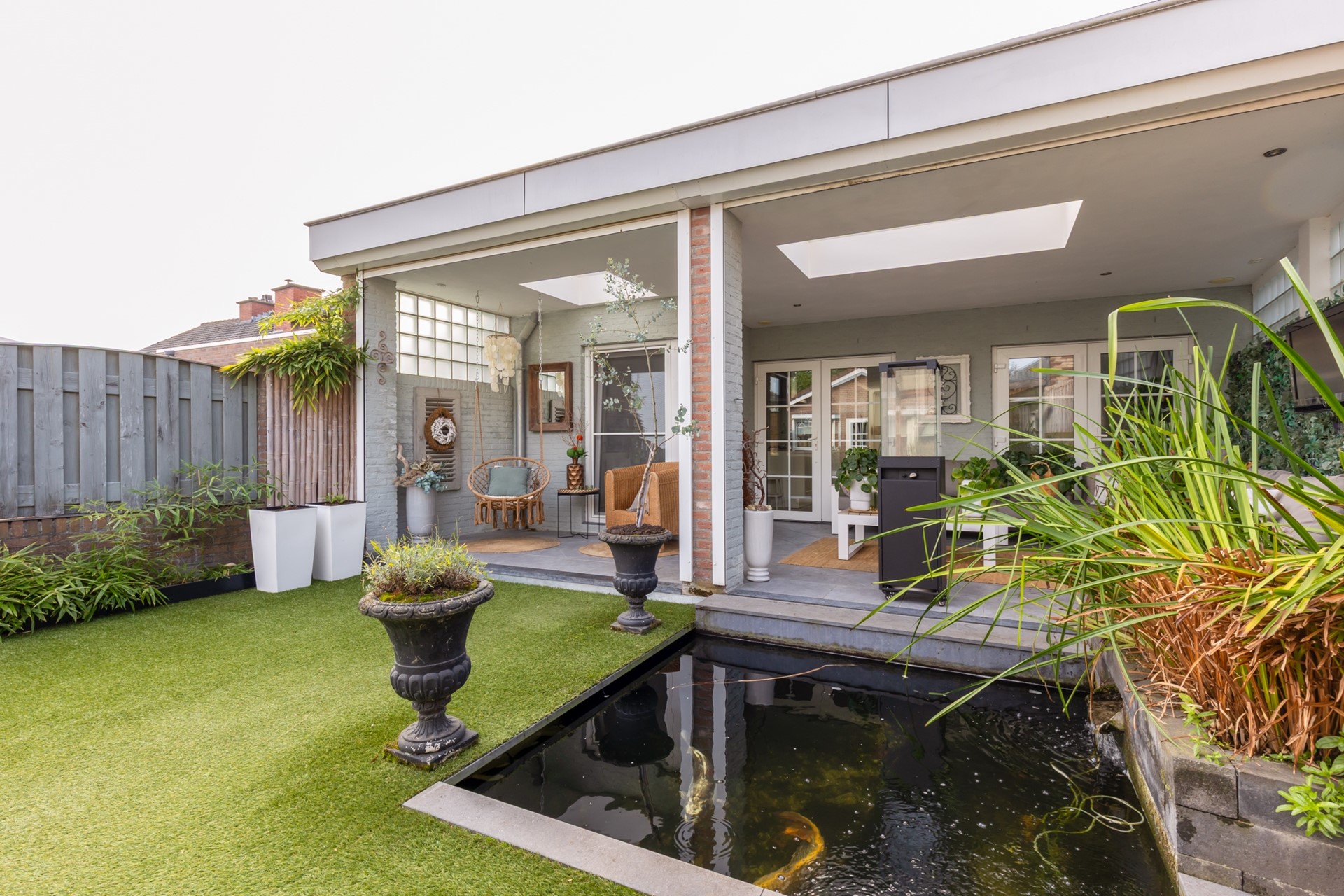 voortuin, gezellige achtertuin met diverse zitgelegenheden waardoor je altijd van de zon of schaduw kunt genieten en met grote aangebouwde overkapping (23m2), vrijstaande overkapping (12m2), koivijver, zwembad, grote garage (36m2) met kap/zolder, elektrische sectionaalpoort en toilet, ruime oprit voor 3 auto’s. Toegang tot perceel via oprit aan achterzijde.