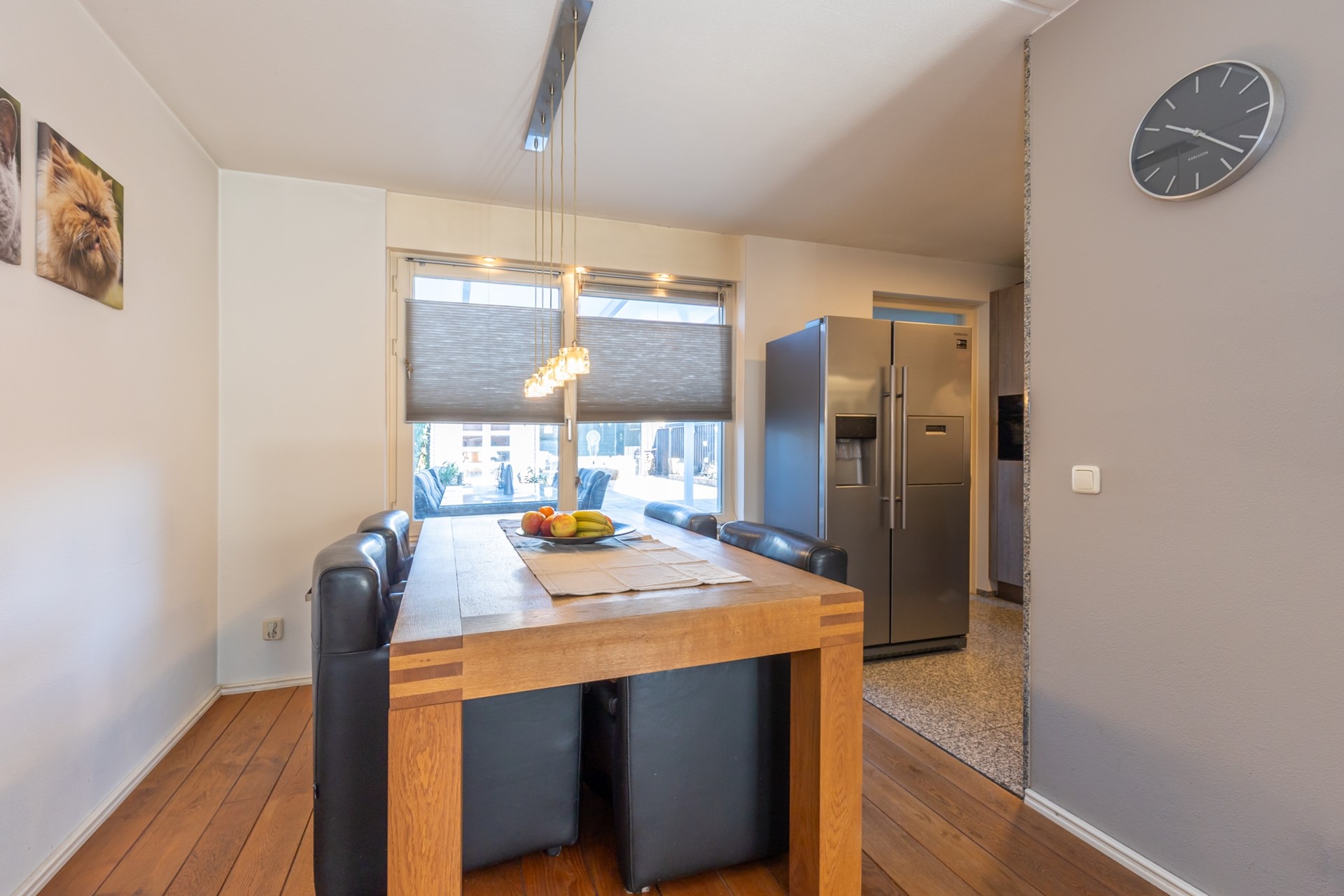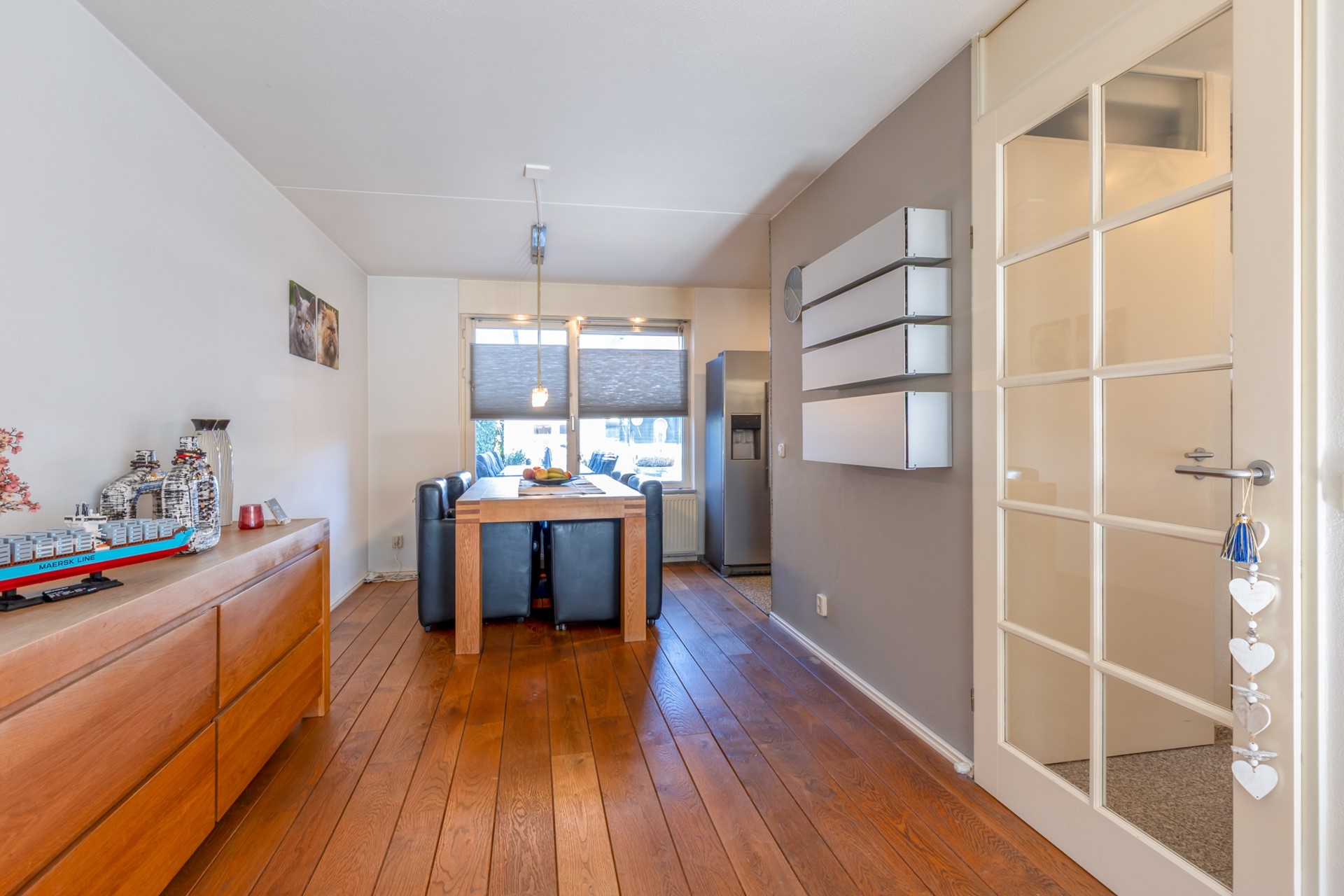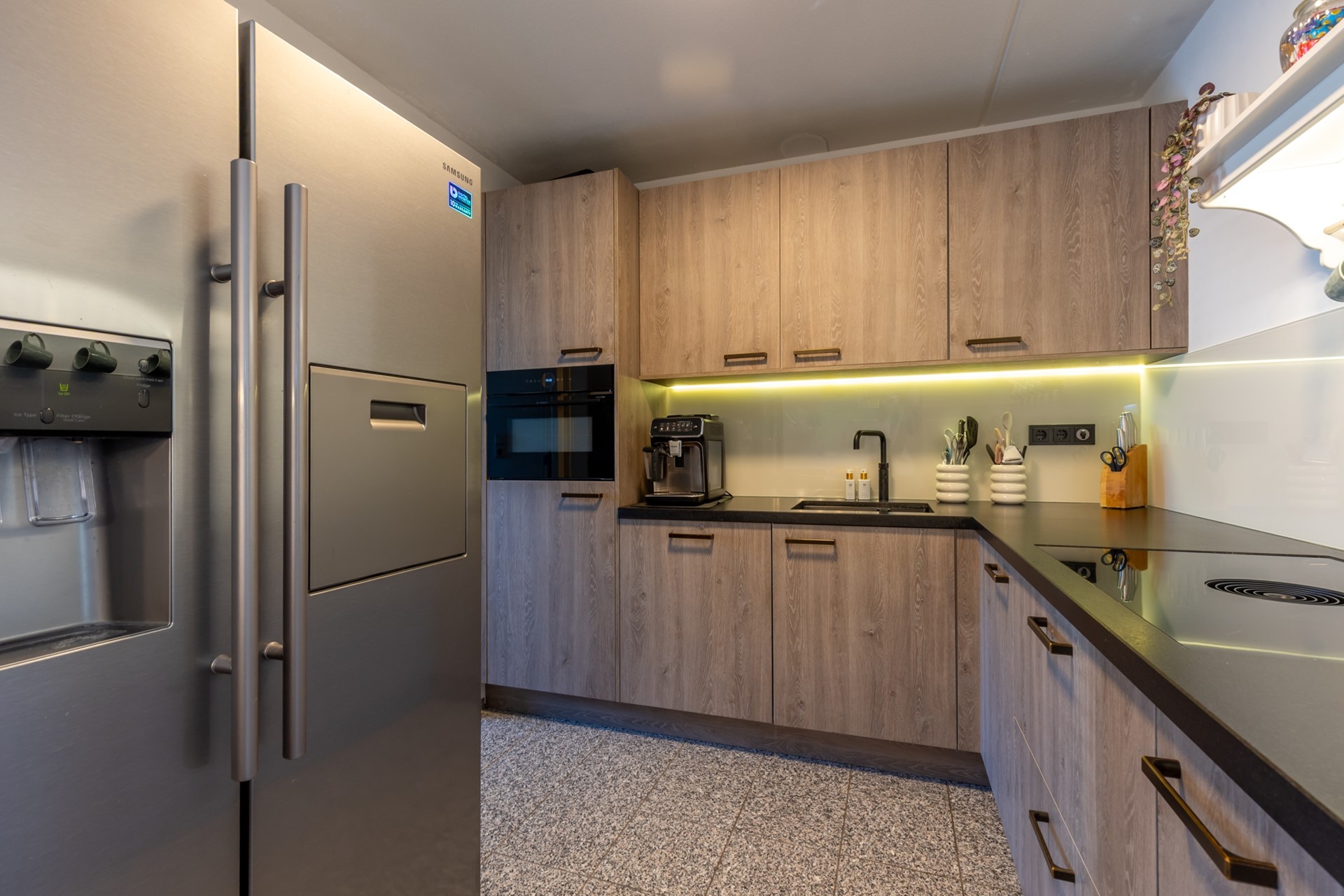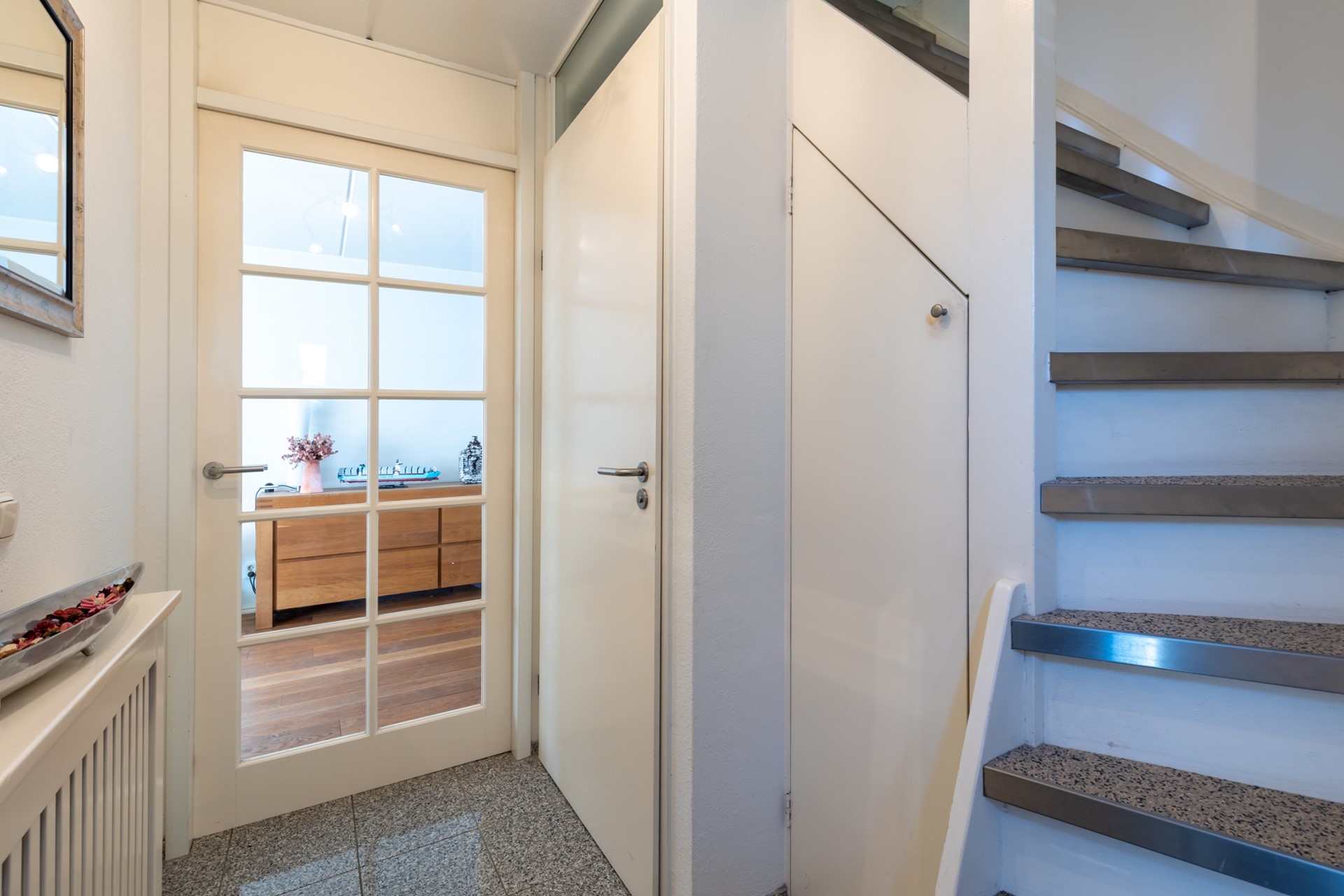 entree, hal, meterkast, moderne toiletruimte (2025) met fonteintje, L-vormige woonkamer (38m2) met parketvloer, moderne half-open keuken (2024, 6,5m2) met combi-oven, Bora inductiekookplaat, vaatwasser en Quooker , bijkeuken/verdeelhal naar inpandig bereikbare garage (6.05*2.70) met elektrische sectionaalpoort