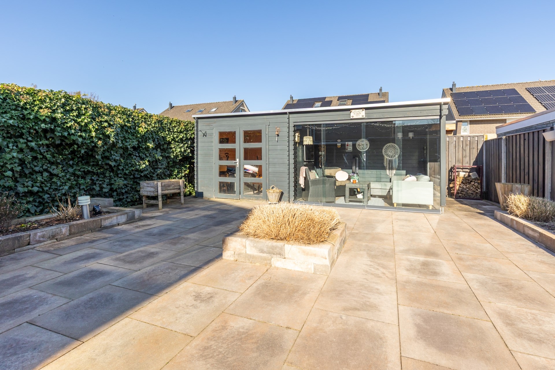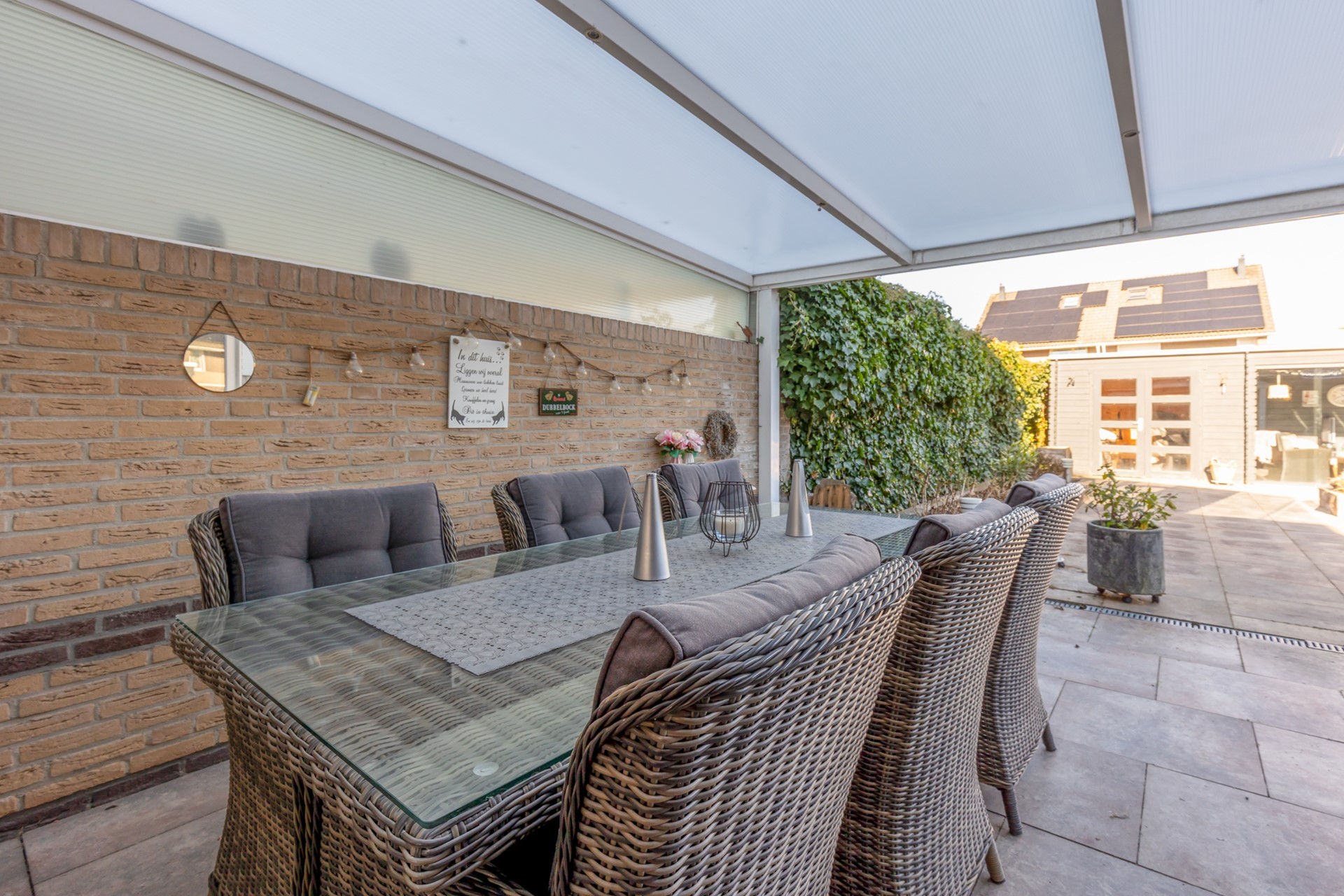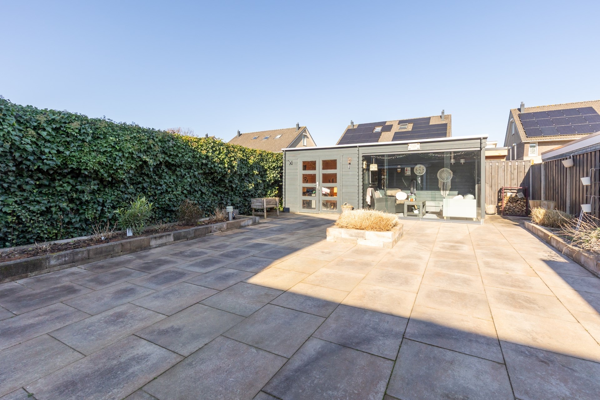voortuin, oprit voor 2 auto’s, diepe achtertuin met terrasoverkapping, houten tuinhuis en lounge