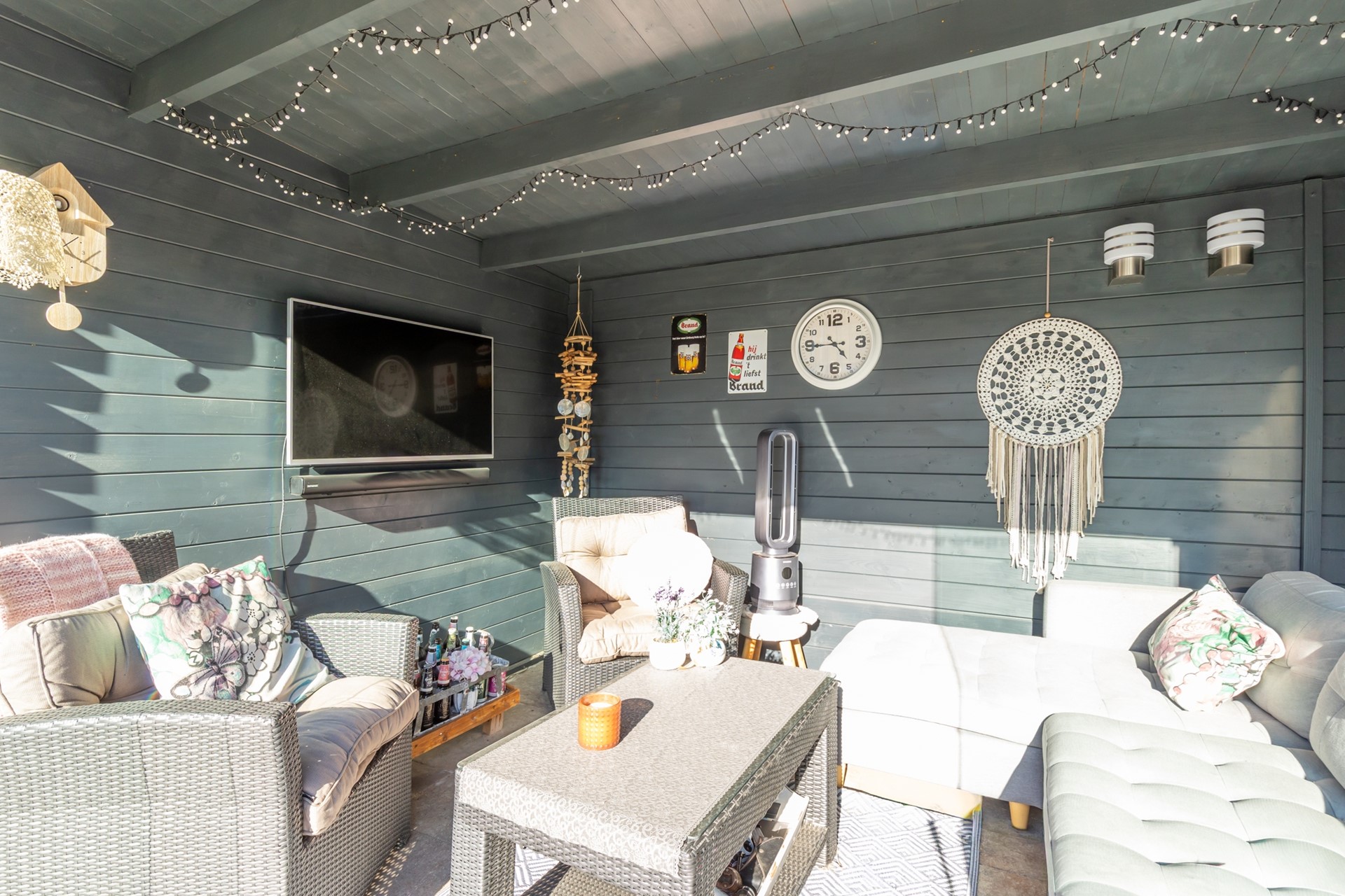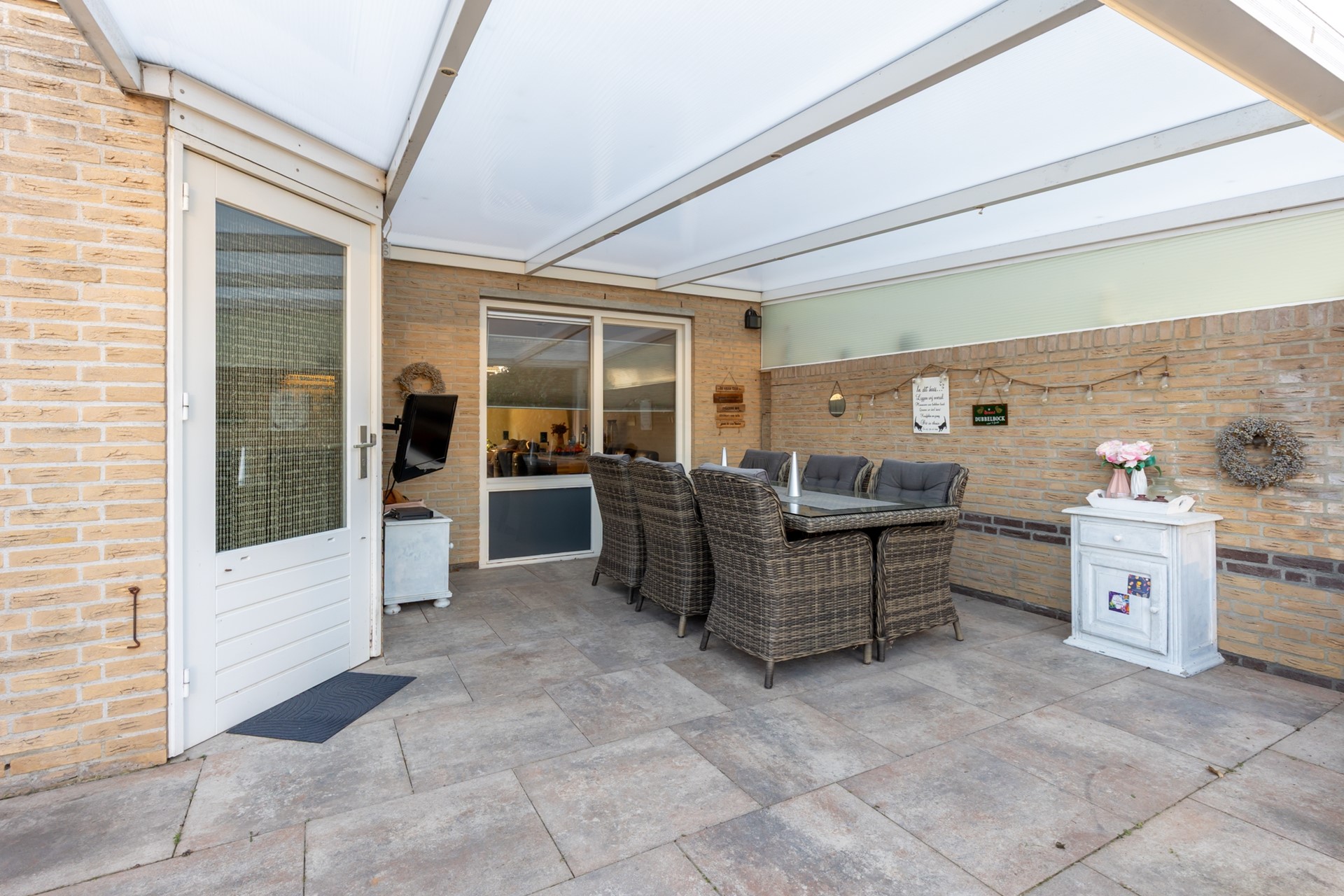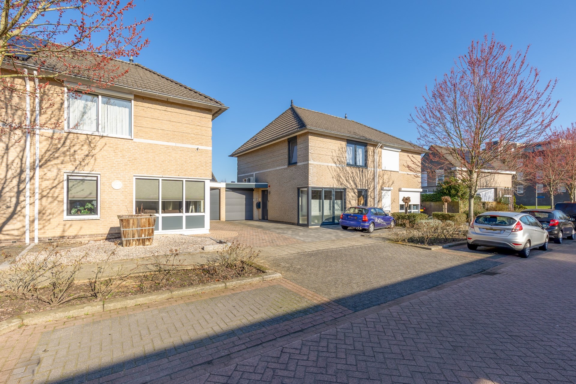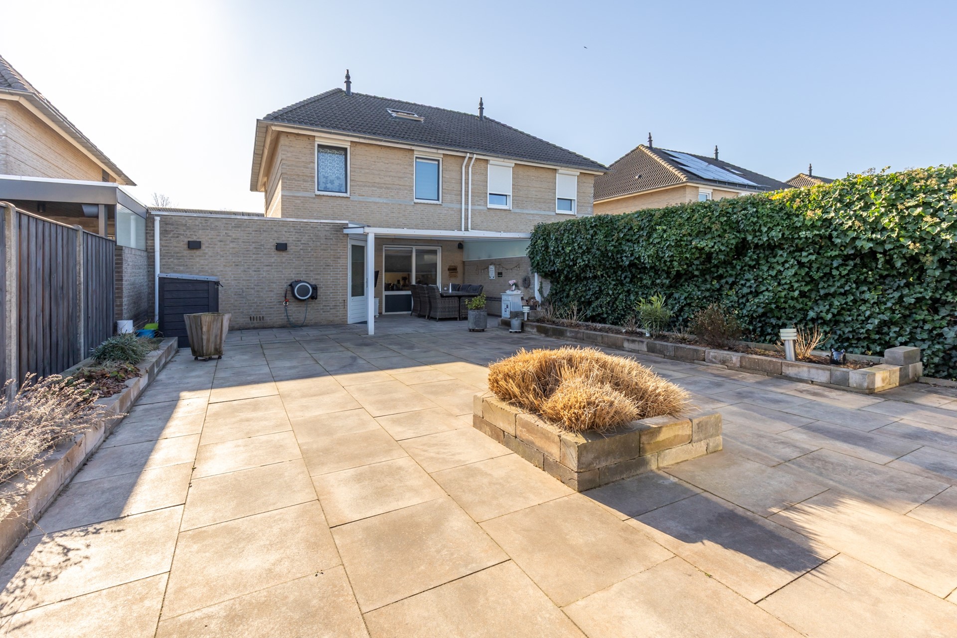 voortuin, oprit voor 2 auto’s, diepe achtertuin met terrasoverkapping, houten tuinhuis en lounge